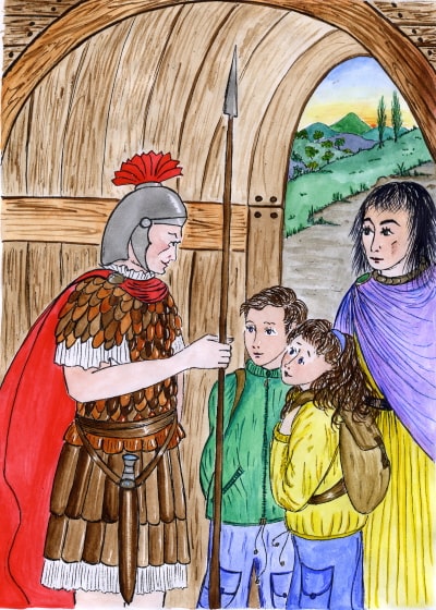The fortified Camp gates loomed large out of the morning mists that rise by great rivers at dawn. There were guards on the gate. From what he could remember from school history lessons, Peter thought they looked like the pictures of legionaries, only their shields were flatter and rounder. They saluted Merlin. One of them spoke in a language that was quite unintelligible to Peter or Sarah. Was it Greek, British, Celt or Latin? Their spirits sank as they began to realise that possibly no-one spoke English here, but then Merlin pointed his staff at them and they found that they were able to understand everything.