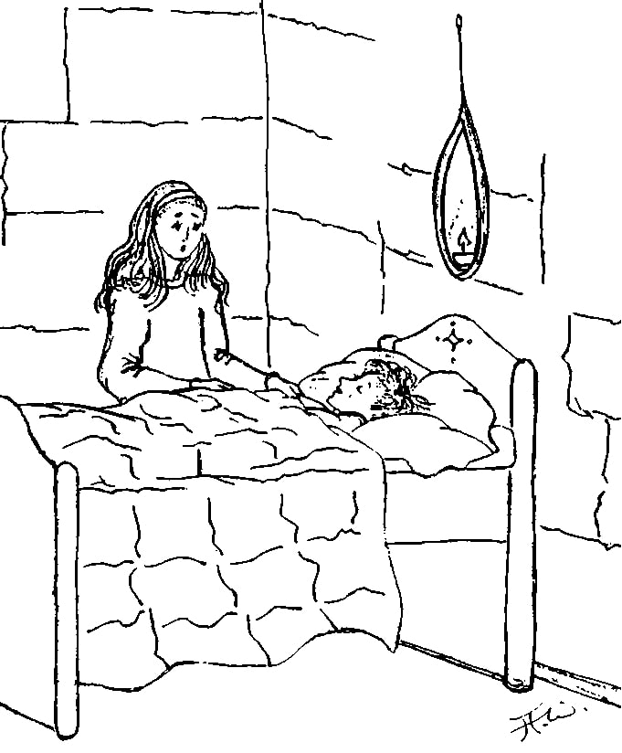 Anir went down a passage to the left, to a room where there were several beds. He placed Peter on one of them. Immediately an Elf maiden appeared with a silver bowl filled with water.