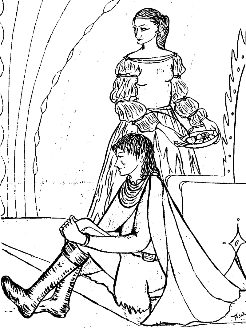 He fell at once in love with her And called to the Lady fair; At last she came towards the tower And found the knight’s cell there.